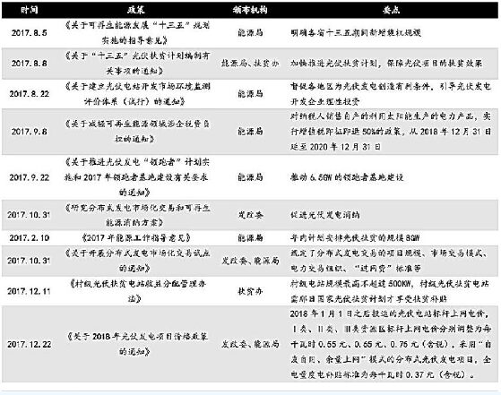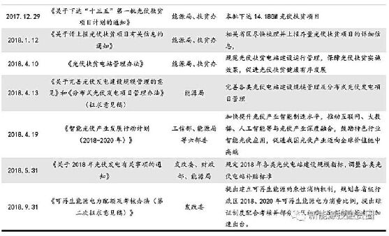 光伏制造各環(huán)節(jié)成本持續(xù)下降,平價(jià)上網(wǎng)即將來臨。2018H1,硅料、硅片、電池片、組件環(huán)節(jié)的制造成本(含稅)已降至65.00 元/kg、3.45 元/片、1.31 元/W、2.27 元/W,系統(tǒng)成本約5.4 元/W。補(bǔ)貼退坡倒逼光伏制造企業(yè)通過產(chǎn)能擴(kuò)張和技術(shù)進(jìn)步不斷降低生產(chǎn)成本,平價(jià)上網(wǎng)即將來臨。平價(jià)上網(wǎng)假設(shè)下,光伏各環(huán)節(jié)成本將進(jìn)一步下降,硅料、硅片、電池片、組件環(huán)節(jié)的制造成本(含稅)分別約為45.00元/kg、2.10元/片、0.77 元/W、1.56元/W,系統(tǒng)成本約3.29元/W。 531 政策短期沖擊明顯,有利于推動(dòng)平價(jià)上網(wǎng)。2018年5月31日,三部委聯(lián)合發(fā)布《關(guān)于2018年光伏發(fā)電有關(guān)事項(xiàng)的通知》,政策影響主要體現(xiàn)在以下兩個(gè)方面:從短期來看,指標(biāo)限制導(dǎo)致我國(guó)2018 年光伏裝機(jī)需求下滑。根據(jù)政策安排,2018年暫不安排通光伏電站指標(biāo),安排10GW左右規(guī)模用于分布式光伏項(xiàng)目。從中長(zhǎng)期來看,光伏補(bǔ)貼退有望推動(dòng)平價(jià)上網(wǎng)加速實(shí)現(xiàn)。政策規(guī)定,自發(fā)文之日起,新投運(yùn)的光伏電站標(biāo)桿上網(wǎng)電價(jià)每千瓦時(shí)統(tǒng)一降低0.05元;新投運(yùn)的、采用“自發(fā)自用、余電上網(wǎng)”模式的分布式光伏發(fā)電項(xiàng)目,全電量度電補(bǔ)貼標(biāo)準(zhǔn)降低0.05元。光伏補(bǔ)貼退坡能夠推動(dòng)企業(yè)通過技術(shù)進(jìn)步降低成本,光伏平價(jià)上網(wǎng)即將到來。 配額制即將落地,或?qū)⒅ζ絻r(jià)上網(wǎng)加速。2018年9月,發(fā)改委下發(fā)《可再生能源電力配額及考核辦法(第二次征求意見稿)》,提出建立可再生能源約束性消納機(jī)制,規(guī)劃各省級(jí)行政區(qū)2018、2020年可再生能源電力消費(fèi)比例,對(duì)保障小時(shí)數(shù)以內(nèi)的集中式風(fēng)電、光伏電量以及其他非水可再生能源發(fā)電量施行全額保障性收購(gòu)(考慮技術(shù)等限制因素最多限電5%)。配額制若能落地,必將提高光伏電站年利用小時(shí)數(shù),進(jìn)一步降低度電成本,助力平價(jià)上網(wǎng)加速。近期光伏政策一覽表如下: