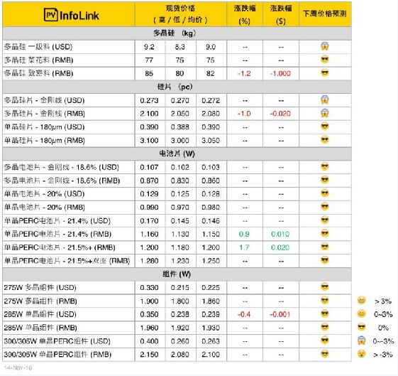硅料價格 11月以來硅料價格基本持穩(wěn),雖然本周致密料價格些微下降,但主流價格與上周維持在差不多的水平。菜花料價格也維持在每公斤75-77元人民幣之間。 目前市場上買賣雙方對于成交價格還是較為保守,在此情況下,單晶硅片廠轉(zhuǎn)而想多用菜花料,而多晶硅片廠多用珊瑚料來降低原料成本。目前硅料的供需尚穩(wěn)定,預估國內(nèi)硅料的價格走勢在年底前都是較為平緩的態(tài)勢。海外部分則是高、低價持續(xù)往下,主流價格也仍是在每公斤9美元往下議價。 硅片價格 本周單、多晶硅片價格在硅料價格穩(wěn)定的情況下變動不大。國內(nèi)多晶硅片的成交價微幅下修,但在硅料價格沒有繼續(xù)大幅降價的情況下,預估也即將落底。 目前整體多晶硅片的開工率較為減少,在沒有過多的供應下,11月底前主流價格應能保持在每片2.05元人民幣上下。海外多晶硅片價格基本也保持在每片0.27元美金之上。 單晶硅片價格本周基本不變,但需求明顯轉(zhuǎn)好,盡管測算硅料成本,單晶硅片價格還有空間下修,但預計價格在12月調(diào)整的可能性較高。 電池片價格 多晶電池片隨著硅片價格逐漸落底、加上印度需求略有回升,短期內(nèi)價格較有支撐,本周價格維持在上周每瓦0.84-0.87元人民幣、0.103-0.107元美金的水平。 單晶方面,隨著應用領跑者的持續(xù)搶裝,21.5%+的PERC電池片供應將一路緊張至年底,由于市場上一片難求,單面21.5%+的PERC電池片本周價格再度上調(diào)0.02元人民幣,市場主流價格靠攏每瓦1.2元人民幣。雙面高效電池片本周則仍是高檔持穩(wěn)在每瓦1.25元人民幣。 在廠商陸續(xù)完成SE的調(diào)適之后,SE變?yōu)镻ERC電池片的標準配備,市場上轉(zhuǎn)換效率21.4%及以下的單晶PERC電池片供應越來越少,逐漸變?yōu)榉侵髁鳟a(chǎn)品,本周維穩(wěn)在上周水平。 海外價格變化較大的部分在臺灣市場,受到臺灣市場年底并網(wǎng)的小幅搶裝潮推動,臺灣各家單晶PERC電池片報價持續(xù)上揚,在上周靠攏每瓦0.165元美金之后,本周有廠商繼續(xù)挑戰(zhàn)每瓦0.17元美金,漲幅明顯。 組件價格 組件與電池片一樣呈現(xiàn)PERC產(chǎn)品供應緊張的態(tài)勢。尤其領跑者所需的單面、雙面310W PERC組件一片難求,單面價格來到每瓦2.2元人民幣上下。300 / 305W 組件海內(nèi)外都有需求支撐、供應也因為電池片提效而逐漸減少,價格穩(wěn)定。