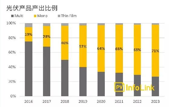 單晶產(chǎn)品持續(xù)強(qiáng)勢(shì)進(jìn)擊 2018年不僅有領(lǐng)跑者計(jì)劃的高單晶份額拉升國(guó)內(nèi)單晶占比、單晶PERC電池片效率也持續(xù)突飛猛進(jìn),造就18年成為單晶產(chǎn)品攻城略地的一年,市場(chǎng)單晶份額由2017年的28%進(jìn)展到2018年的46%。 展望2019年,單晶PERC主流組件瓦數(shù)可能在二季度即站上310W,與多晶組件仍以275W為多拉開(kāi)了35W的顯著差距,也讓海內(nèi)外市場(chǎng)選擇單晶組件的比重更加提升。 且后續(xù)還有硅片薄化能夠幫助降本、電池片仍有空間提效率等等,再加上明年新一波的領(lǐng)跑者可能又會(huì)再次讓市場(chǎng)看到組件瓦數(shù)的躍進(jìn),P型單晶產(chǎn)品持續(xù)挾高性?xún)r(jià)比在明年強(qiáng)勢(shì)進(jìn)擊。