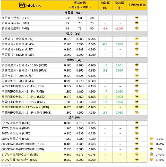 硅料價(jià)格 本周硅料價(jià)格又開始有些微滑落,致密料降幅約2塊人民幣,價(jià)格范圍在每公斤79-82元人民幣,致密料微跌的態(tài)勢(shì)可能在短期內(nèi)皆是如此。菜花料部分,雖然因?yàn)槎嗑Мa(chǎn)品需求提升,加上部分單晶廠采用菜花料的支撐,本周價(jià)格沒有下跌,但預(yù)計(jì)12月底前價(jià)格仍有可能小幅下修。目前致密料與菜花料的價(jià)差再度縮小至每公斤5元人民幣。海外部分,價(jià)格保持,但成交明顯增加,成交價(jià)格仍在每公斤8.3-9美元之間。 硅片價(jià)格 本周國(guó)內(nèi)多晶硅片價(jià)格有小幅上漲,主因在于多晶產(chǎn)品的需求提升,兩家多晶硅片大廠提升了價(jià)格,但其余多晶硅片廠則仍保持在上周水平。其中協(xié)鑫、榮德目前價(jià)格約在每片2.1元人民幣左右,其他成交價(jià)格則多在每片2.05-2.08元之間。 海外的多晶硅片價(jià)格,因?yàn)閰R率回升,目前訂單價(jià)格多維持在每片0.265-0.27美元之間。多晶硅片在需求及匯率的助攻下,下周有望繼續(xù)小幅反彈。單晶硅片本周則基本沒有變化。 電池片價(jià)格 11月中旬開始,市場(chǎng)逐漸感受到多晶需求小有增溫,加上先前陸續(xù)有電池廠逐漸減少多晶電池片制造或轉(zhuǎn)換為單晶PERC,使得多晶電池片重回供需平衡的狀態(tài),而受到年底需求優(yōu)于預(yù)期影響,12月多晶電池片、單晶PERC電池片價(jià)格成功上漲。 12月轉(zhuǎn)換效率18.7%之多晶電池片成交價(jià)格全面站上每瓦0.88元人民幣、0.105-0.107美金。然而,不論是針對(duì)海外或國(guó)內(nèi)市場(chǎng),多晶電池片訂單大多以年底前的需求為主,故須觀察12月中旬后多晶電池片需求是否會(huì)稍有轉(zhuǎn)弱。 PERC電池片部分,由于SE-PERC的比重快速拉升,市場(chǎng)上轉(zhuǎn)換效率21.2%-21.4%的普通PERC電池片供應(yīng)銳減,本月價(jià)格也小有上揚(yáng),達(dá)到1.18-1.2元人民幣。 高效PERC電池片得利于領(lǐng)跑者需求的支撐,價(jià)格上漲幅度明顯,本周轉(zhuǎn)換效率21.5%+的PERC單面電池片上漲至1.25-1.28元人民幣上下。 海外PERC電池片價(jià)格也一同起漲,尤其臺(tái)灣市場(chǎng)適逢年底拉貨潮,需求火熱,臺(tái)灣單晶PERC電池片價(jià)格站上每瓦0.168-0.172元美金。 組件價(jià)格 組件部分,四季度國(guó)內(nèi)內(nèi)需情況不差,加上過去歐洲訂單大多依賴東南亞產(chǎn)能出貨、現(xiàn)在則可用成本更低的中國(guó)本土產(chǎn)能直接輸歐,使得四季度國(guó)內(nèi)一、二線組件大廠開工率優(yōu)于預(yù)期,目前海內(nèi)外各樣組件價(jià)格都較為持穩(wěn)。 然而,近期不僅電池片漲價(jià),多數(shù)玻璃廠家成交價(jià)在12月也上漲了10-15%,墊高組件廠成本。且近日陸續(xù)傳出明年交貨的多晶組件成交價(jià)格明顯走低,因此明年多晶組件的價(jià)格走勢(shì)仍需審慎看待。 *黃色欄位為本周新增項(xiàng)目,更動(dòng)如下: Cell 1.因應(yīng)市場(chǎng)效率提升,多晶電池片效率改為18.7%。 2.新增效率21.5%以上單面、雙面單晶PERC電池片美金價(jià)格。 Module 因應(yīng)市場(chǎng)效率提升,新增310W 單晶PERC組件美金及人民幣價(jià)格。