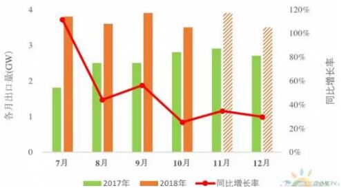 本文通過對產(chǎn)能約80GW的組件企業(yè)2019年一季度的訂單情況調(diào)研發(fā)現(xiàn): 除個別企業(yè)外,一線企業(yè)的訂單基本可以實現(xiàn)滿產(chǎn),部分企業(yè)的訂單甚至排到二季度;海外市場的訂單約占74%,成為國內(nèi)企業(yè)的重要支撐。 由于二線企業(yè)在海外布局少,因此2019年一季度的產(chǎn)能利用率低;現(xiàn)有組件企業(yè)出現(xiàn)“馬太效應(yīng)”,部分小企業(yè)會被淘汰出局。 1、撲朔迷離的2019國內(nèi)市場 從2013年國八條開始,到2015年,光伏行業(yè)每個月從中央到地方各種政策輪番出臺。一個月,總會有幾個新政策出臺。筆者曾經(jīng)整理近百份份國家級政策和300多份地方級政策,整整3500多頁,厚厚幾大本跟磚頭一樣的《政策匯編》!與之對應(yīng)的,是國內(nèi)光伏市場的鼎沸,從2014年的10.6GW開始,一直到2017年53GW。2018年初,對國內(nèi)市場60GW的預測都屬于保守預測。 然而,這一切隨著“531政策”出臺戛然而止!531之后,國內(nèi)光伏行業(yè)出臺的新政策寥寥無幾,僅有的幾個圍繞“531政策”做進一步解釋的文件和幾個地方性政策出臺。與之對應(yīng)的是,所有的行業(yè)從業(yè)者,都無法判斷明年的國內(nèi)市場。2019年,光伏行業(yè)充滿不確定性。唯一確定的是,2019年一季度國內(nèi)市場會非常冷淡。 2、異軍突起的海外市場 與充滿不確定性的國內(nèi)市場相比,大家一直看好未來的海外市場。531之后,與低迷的國內(nèi)市場相比,海外市場呈現(xiàn)出快速增長的趨勢,在之前的文章《2018年海外新增約70GW,明年會更好!》中也做過介紹。 根據(jù)PVinfolink的調(diào)研數(shù)據(jù),將2017H2和2018H2的出口數(shù)據(jù)進行對比,如下圖所示。