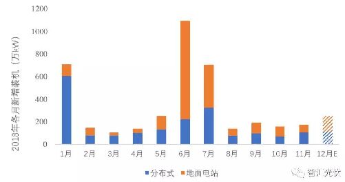 2018年12月20日,中電聯(lián)公布了《2018年1-11月份電力工業(yè)運行簡況》,并介紹: 全國基建新增裝機容量同比減少,其中太陽能發(fā)電和火電新增裝機減少較多。 1-11月份,全國基建新增發(fā)電生產(chǎn)能力9877萬千瓦,比上年同期少投產(chǎn)1458萬千瓦。其中, 水電713萬千瓦、火電3017萬千瓦、核電596萬千瓦、風電1720萬千瓦、太陽能發(fā)電3822萬千瓦。 水電、火電和太陽能發(fā)電比上年同期少投產(chǎn)314、909和1043萬千瓦,核電和風電分別比上年同期多投產(chǎn)379和420萬千瓦。 全國太陽能發(fā)電設(shè)備平均利用小時1148小時。 之前15省公布了大量項目要趕在12月底實現(xiàn)并網(wǎng),考慮到這部分的裝機規(guī)模,因此,預(yù)期2018年的全年裝機規(guī)模約為40.5GW,各月的裝機規(guī)模如下。其中,12月為預(yù)測值。