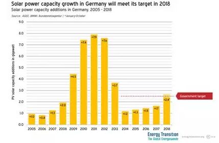 2018年對(duì)德國光伏有著重要的意義。這一年,是德國自2014年以來五年中首年光伏裝機(jī)超過2GW的節(jié)點(diǎn)。這一年,可再生能源發(fā)電量占比超過40%,德國可再生能源事業(yè)取得了亮眼的成績。 最重要的是,讓我們記住2018年的原因,是2018年可能是未來十年德國光伏的新起點(diǎn)。2014~2018年裝機(jī)量在節(jié)節(jié)爬升的趨勢下,2019年光伏又將如何發(fā)展? 西方戰(zhàn)車覺醒 首次達(dá)到2.5GW目標(biāo) 德國光伏也曾經(jīng)歷過大躍進(jìn)的年代,2009年新增裝機(jī)4.5吉瓦,2010-2012年連續(xù)三年新增裝機(jī)超過7吉瓦,是德國光伏發(fā)展的高光時(shí)刻。此后,由于光伏趨勢的調(diào)整,2013年作為緩沖,2014年光伏裝機(jī)量顯現(xiàn)出斷崖式下跌。隨后德國政府為新增光伏設(shè)立了2.5吉瓦的目標(biāo),但是2014-2017年連續(xù)四年新增裝機(jī)均低于2吉瓦。 2018年,這一低迷狀態(tài)終于好轉(zhuǎn)。