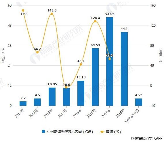2011-2019年1-2月中國新增光伏裝機(jī)容量統(tǒng)計(jì)情況