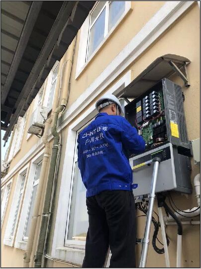 (圖為正泰安能電力系統(tǒng)工程有限公司電站運(yùn)維售后技術(shù)人員正在對(duì)衢州市龍游縣湖鎮(zhèn)鎮(zhèn)安裝的俞先生家的電站進(jìn)行維修處理)