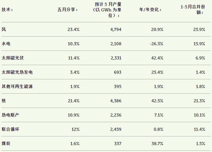 根據(jù)西班牙電網(wǎng)運(yùn)營商 Red Electrica de 近期發(fā)布的最新數(shù)據(jù)顯示,5 月份可再生能源生產(chǎn)了西班牙 50.7%的電力,與去年同期相比,“綠色吉瓦時”增加了10%。 這是可再生能源電力在連續(xù)兩個月下降后重獲增長,4 月份西班牙電力生產(chǎn)結(jié)構(gòu)中的可再生能源份額為 46.2%。 REE還強(qiáng)調(diào)了太陽能光伏電站實(shí)現(xiàn)的創(chuàng)紀(jì)錄產(chǎn)量,5 月份光伏發(fā)電量為2,331GWh,創(chuàng)下自2007年國家記錄光伏發(fā)電量以來最高的月產(chǎn)量。 下表總結(jié)了西班牙 5 月份電力結(jié)構(gòu)的構(gòu)成: