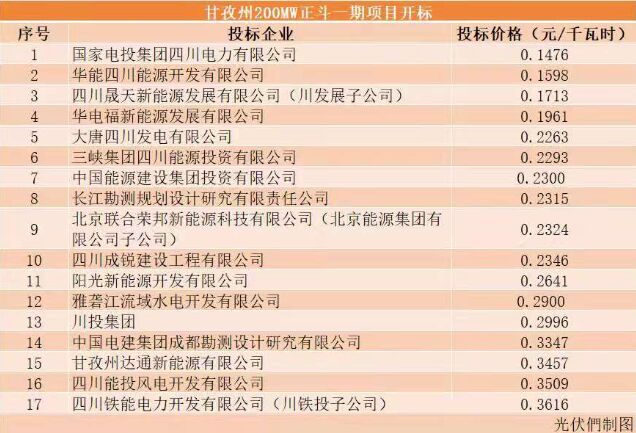 6月16日,四川甘孜州正斗一期200MW光伏基地開標。據(jù)光伏們了解,共269家投資企業(yè)報名參與該項目競標,其中繳納保證金的共有24家,23家企業(yè)進入現(xiàn)場投標,最后17家企業(yè)進入報價環(huán)節(jié)。其中,國家電投集團四川電力有限公司以最低價0.1476元/千瓦時預中標,同時也創(chuàng)下國內(nèi)光伏電站上網(wǎng)電價最低記錄。另外,有四家企業(yè)投標價格兩毛以下。 在17家參與投標的企業(yè)中,國家電投、華電、三峽、大唐國家開發(fā)投資集團以及中國能建、中國電建等電力投資央企悉數(shù)到場。此外,以晟天新能源、四川能投、四川鐵投、川投集團、甘孜州達通新能源等為代表的四川本地國有企業(yè)也深度參與其中。值得強調(diào)的是,此次僅有陽光新能源、四川成銳建設兩家民營企業(yè)參與。隨著平價時代,各省光伏投資產(chǎn)業(yè)配套要求持續(xù)加碼,光伏電站投資開發(fā)領域民營企業(yè)占比進一步縮小。以下是投標企業(yè)報價(由低到高):