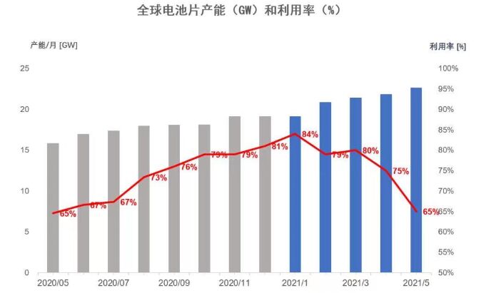 備注:根據(jù)賀利氏內(nèi)部數(shù)據(jù),6月份全球太陽(yáng)能電池片產(chǎn)能利用率進(jìn)一步下降,目前產(chǎn)能利用率保持在65%左右