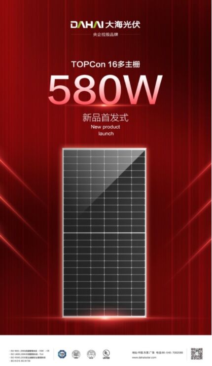 11月19日,大海光伏580W高功率光伏組件在山東省東營市廣饒開發(fā)區(qū)大海光伏基地正式下線。