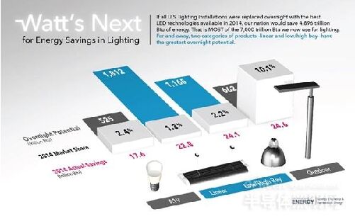 據(jù)悉,美國能源署(DOE)近日發(fā)布了一份題為《LED在普通照明應(yīng)用中的使用》的報告。這項報告不僅估算了2014年LED在10大照明應(yīng)用中的節(jié)能效果,還預(yù)估了這些照明應(yīng)用完全采用LED產(chǎn)品的節(jié)能潛力。 據(jù)報告顯示,由于LED光源的采用,2014年節(jié)約能源為143萬億英熱單位(相當(dāng)于節(jié)省成本約14億美元),但如果所有應(yīng)用中的通宵照明產(chǎn)品都換成LED光源,將節(jié)約近4,896萬億英熱單位(相當(dāng)于節(jié)省成本490億美元)。 2012-2014,LED在所有應(yīng)用中的安裝量增加,整體增幅超過四倍至215萬,但市場滲透率仍然不大,攀升至3%。小型定向LED光源仍然是市場份額的領(lǐng)先者,從2012年的10%增加到2014年的22%,增長或在未來幾年放緩。2014年,LED光源占戶外應(yīng)用市場份額為10%,占室內(nèi)應(yīng)用市場份額為2.8%。