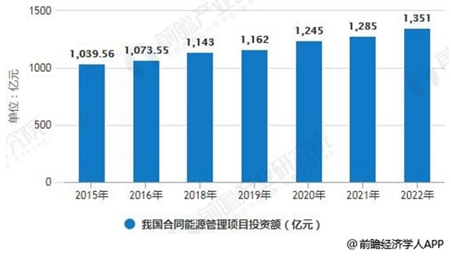 中國合同能源管理項(xiàng)目投資額分析預(yù)測 2015年,我國合同能源管理項(xiàng)目投資額為1039.56億元,同比增長8.43%。到了2016年我國合同能源管理項(xiàng)目投資額為1073.55億元,同比增長3.27%。綜合以上因素,預(yù)計(jì)2018年我國合同能源管理項(xiàng)目投資額將達(dá)到1143億元,未來五年(2018-2022)年均復(fù)合增長率約為4.26%,預(yù)測到了2022年我國合同能源管理項(xiàng)目投資額將達(dá)到1351億元。