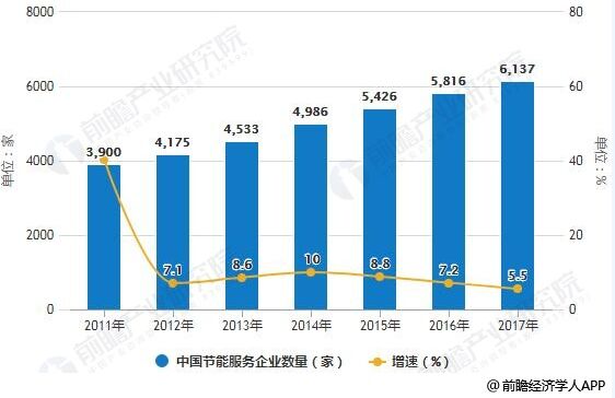 2011-2017年中國節(jié)能服務(wù)企業(yè)數(shù)量統(tǒng)計及增長情況