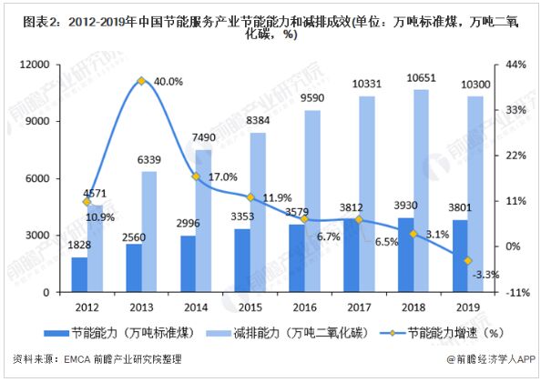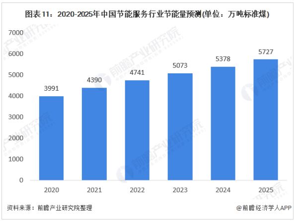 2017年1月,國務(wù)院印發(fā)《“十三五”節(jié)能減排綜合工作方案》,到2020年,全國萬元國內(nèi)生產(chǎn)總值能耗比2015年下降15%,能源消費(fèi)總量控制在50億噸標(biāo)準(zhǔn)煤以內(nèi)。全國化學(xué)需氧量、氨氮、二氧化硫、氮氧化物排放總量分別控制在2001萬噸、207萬噸、1580萬噸、1574萬噸以內(nèi),比2015年分別下降10%、10%、15%和15%。全國揮發(fā)性有機(jī)物排放總量比2015年下降10%以上。 “十三五”結(jié)束后馬上迎來“十四五”,節(jié)能作為國家長期發(fā)展方針,前瞻認(rèn)為國家對能源消耗的控制力度將越來越大,結(jié)合節(jié)能創(chuàng)新能力的提高,節(jié)能服務(wù)行業(yè)的節(jié)能能力也將隨之加強(qiáng)。2019年EMCA的數(shù)據(jù)顯示,我國節(jié)能服務(wù)產(chǎn)業(yè)節(jié)能能力從2012年1774.46萬噸標(biāo)準(zhǔn)煤增長到3801萬噸標(biāo)準(zhǔn)煤。預(yù)計(jì)在2025年,我國節(jié)能服務(wù)產(chǎn)業(yè)節(jié)能能力將超過5727萬噸標(biāo)準(zhǔn)煤。