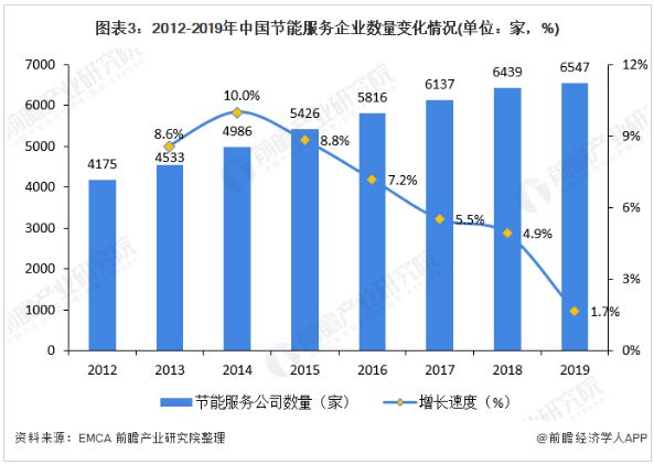 2、中國節(jié)能服務(wù)參與者數(shù)量逐年增加 據(jù)中國節(jié)能協(xié)會統(tǒng)計(jì)數(shù)據(jù)顯示,在過去十幾年間,全國運(yùn)用合同能源管理機(jī)制實(shí)施節(jié)能項(xiàng)目的節(jié)能服務(wù)公司從最初的3家(北京EMCO、遼寧EMCO和山東EMCO),發(fā)展到2005年的76家,2010年進(jìn)一步發(fā)展到782家。 2012-2019年,全國從事節(jié)能服務(wù)業(yè)務(wù)的企業(yè)數(shù)量逐年上升,但增速緩慢。根據(jù)中國節(jié)能協(xié)會發(fā)布的《2019節(jié)能服務(wù)產(chǎn)業(yè)發(fā)展報(bào)告》,截至2019年底,全國從事節(jié)能服務(wù)的企業(yè)有6547家,較上年增加108家,年增長率為1.7%,增長率較2018年降低3.2個(gè)百分點(diǎn)。