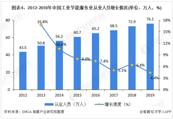 2012-2019年間,中國節(jié)能服務(wù)行業(yè)從業(yè)人員逐年增長,增長速度整體呈下降趨勢。截至2019年底,中國節(jié)能服務(wù)行業(yè)從業(yè)人員76.1萬人,比上年增加3.2萬人,年增長率為4.4%。