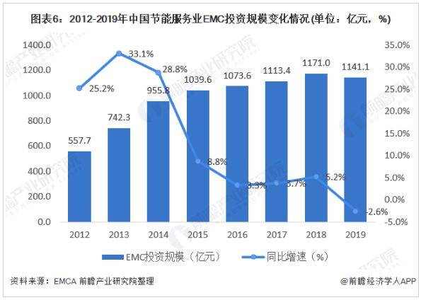 隨著國內(nèi)節(jié)能服務(wù)業(yè)的迅猛發(fā)展,節(jié)能服務(wù)業(yè)合同能源管理(EMC)項(xiàng)目投資也迅速增長。2012-2018年,EMC投資規(guī)模維持增長趨勢,投資增速有所下降。2019年我國合同能源管理投資實(shí)現(xiàn)2.6%的負(fù)增長,達(dá)到1141.1億元。