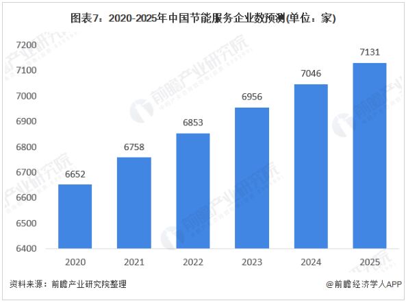 4、中國節(jié)能服務(wù)行業(yè)發(fā)展前景預(yù)測:節(jié)能量有有望超過5700萬噸標(biāo)準(zhǔn)煤 2019年EMCA的數(shù)據(jù)顯示,目前我國節(jié)能服務(wù)企業(yè)數(shù)量已經(jīng)達(dá)到6547家,超過“十三五”規(guī)劃目標(biāo),未來,隨著國家對節(jié)能環(huán)保重視程度的不斷提高,我國節(jié)能服務(wù)企業(yè)數(shù)量將呈現(xiàn)進(jìn)一步的增加。 相比較過去粗放增長而言,未來國家將會更加嚴(yán)格地規(guī)范其資質(zhì),節(jié)能服務(wù)企業(yè)數(shù)量增長速度可能會有所放緩,預(yù)計(jì)2020年全國節(jié)能服務(wù)公司數(shù)量將達(dá)到約6652家,2025年,全國節(jié)能服務(wù)企業(yè)數(shù)量將超過7131家。