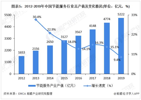 3、中國節(jié)能服務(wù)市場規(guī)模遞增 2012年以來,國內(nèi)節(jié)能服務(wù)行業(yè)發(fā)生了迅猛的發(fā)展,2019年,中國節(jié)能服務(wù)產(chǎn)業(yè)總產(chǎn)值達(dá)到5222億元,同比增長9.4%。