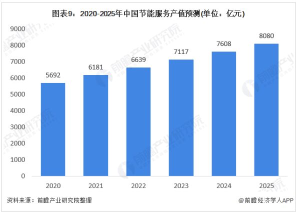 2019年EMCA的數(shù)據(jù)顯示,我國節(jié)能服務(wù)產(chǎn)業(yè)總產(chǎn)值從2012年的1653億元增長到2019年5222億元,增長速度持續(xù)下降。近幾年來,我國節(jié)能服務(wù)產(chǎn)業(yè)利好政策頻發(fā),加上國家對節(jié)能環(huán)保的重視程度不斷加深。從長遠(yuǎn)來看,未來隨著節(jié)能服務(wù)產(chǎn)業(yè)規(guī)模的不斷擴(kuò)大,其發(fā)展速度將隨著行業(yè)不斷的接近飽和發(fā)展而放緩,到2025年,全國節(jié)能服務(wù)產(chǎn)業(yè)總產(chǎn)值將約達(dá)到8080億元。