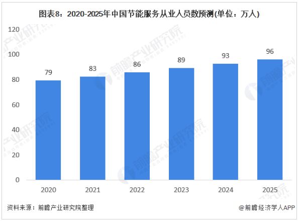 2019年EMCA的數(shù)據(jù)顯示,全國從事節(jié)能服務(wù)產(chǎn)業(yè)人員從2012年底43.5萬人增長到76.1萬人。未來,隨著節(jié)能服務(wù)產(chǎn)業(yè)規(guī)模的不斷擴(kuò)大,從業(yè)人員將呈現(xiàn)逐漸增多的趨勢,但隨著行業(yè)對從業(yè)人員門檻的提高,增速仍將繼續(xù)放緩。預(yù)計(jì)2020年,全國節(jié)能服務(wù)產(chǎn)業(yè)從業(yè)人員將達(dá)到79萬人,2025年,全國從事節(jié)能服務(wù)產(chǎn)業(yè)人員將超過96萬人。