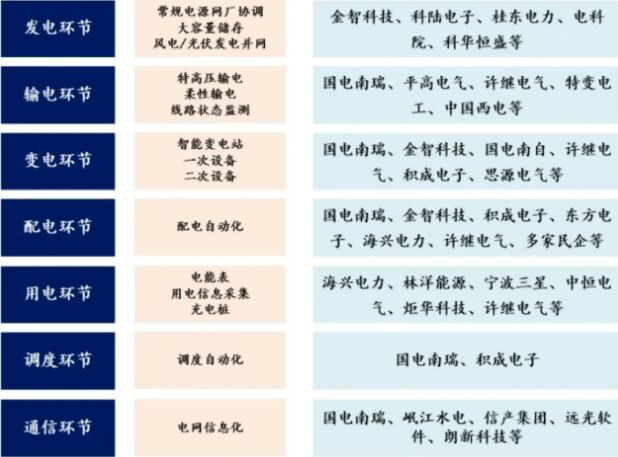 智能電網(wǎng)投資重點(diǎn)在用電、配電、變電及通信環(huán)節(jié),主要對(duì)各類(lèi)一次設(shè)備(包含特高壓及柔性輸電設(shè)備)、二次設(shè)備(各環(huán)節(jié)自動(dòng)化設(shè)備及系統(tǒng))、信息化設(shè)備及工程等有較大需求。