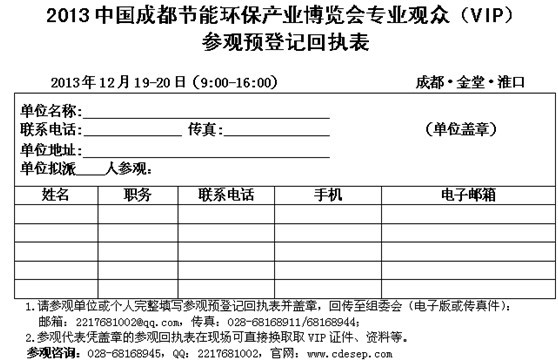 四川省環(huán)境保護(hù)產(chǎn)業(yè)協(xié)會(huì)、四川省環(huán)境和資源綜合利用協(xié)會(huì)、成都工業(yè)經(jīng)濟(jì)聯(lián)合會(huì)、成都表面工程行業(yè)協(xié)會(huì)等川內(nèi)專業(yè)協(xié)會(huì)團(tuán)體同期召開年會(huì)及技術(shù)交流會(huì),組織會(huì)員單位參展參觀。 參展參觀免費(fèi) 往返班車接送 參觀觀眾可通過大會(huì)官網(wǎng)進(jìn)行參觀預(yù)登記(www.cdesep.com/cang.shtml),或填寫“參觀預(yù)登記回執(zhí)表”蓋章并按表格下方要求回傳至組委會(huì),或帶名片至展會(huì)現(xiàn)場(chǎng)換取相關(guān)證件。