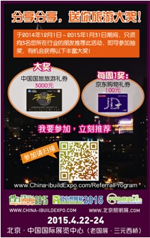 分享分享,送您旅游大獎! 為感謝眾多業(yè)內(nèi)人士對本展會的關(guān)注與支持,并將北京智能建筑展的概念持續(xù)傳播,展會主辦方特推出“ 分享分享,送您旅游大獎 之”計劃。 于2014年12月1日-2015年1月31日期間,只須向3名您所在行業(yè)的朋友推薦此活動,即可參加抽獎,贏取中國國旅旅游禮券3000元! 另每周也有機(jī)會贏得京東購物禮券100元,趕快參加,不容錯過! 參加請登入:http://www.China-ibuildExpo.com/ReferralProgram